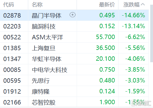 半导体板块全线回落。晶门半导体跌逾14%,脑洞科技跌逾13%,ASM太平洋跌逾6%,上海复旦跌逾5%,华虹半导体跌逾4%。