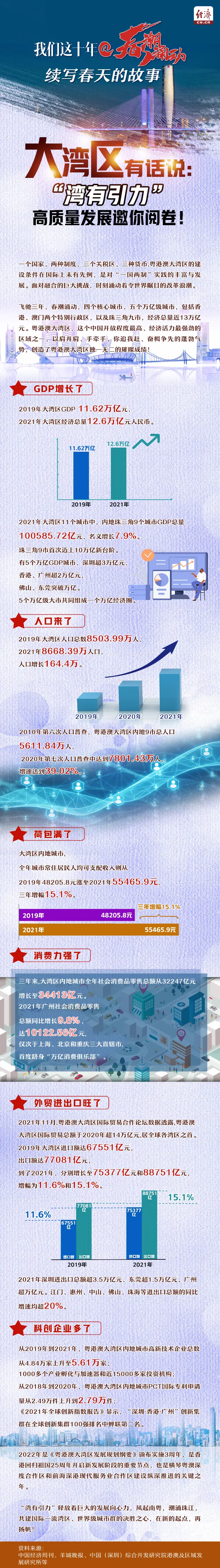 飞驰三年,春潮涌动,四个核心城市、五个万亿级城市,包括香港、澳门两个特别行政区,以及珠三角九市,经济总量近13万亿元。粤港澳大湾区,这个中国开放程度最高、经济活力最强劲的区域之一,以肩并肩、手牵手、你追我赶、奋楫争先的蓬勃气势,创造了粤港澳大湾区独一无二的璀璨成绩!