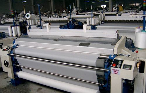 6. 喷水织机:通过喷射水柱,牵引纬纱穿越梭口的无梭织机,转速快,产量高。