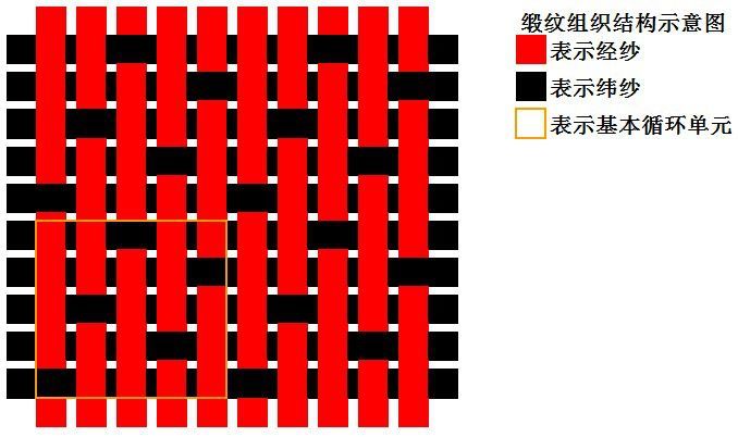 缎纹:每间隔四根以上的纱线才发生一次经纱与纬纱的交错,且这些交织点为单独的、互不连续的、均匀分布在一个组织循环内。织物表面具有较长的经向或纬向的浮长线