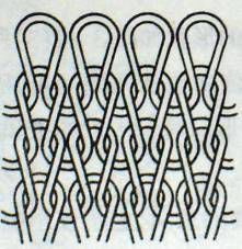 (2)、针织物:由纱线编织成圈而形成的织物,分为纬编和经编。a、纬编针织物是将纬线由纬向喂入针织机的工作针上,使纱线有顺序地弯曲成圈,并相互穿套而成。b、经编针织物是采用一组或几组平行排列的纱线,于经向喂入针织机的所有工作针上,同时进行成圈而成。