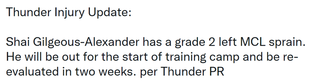 北京时间9月22日,雷霆官方宣布,球队后卫亚历山大被诊断出左膝内侧副韧带二级扭伤,他将在两周后接受伤情重新评估,预计缺席训练营初期。NBA数据显示,这一伤病平均伤停41天。雷霆再次受到伤病打击,此前,他们的榜眼霍姆格伦在半职业联赛意外受伤,预计赛季报销。
